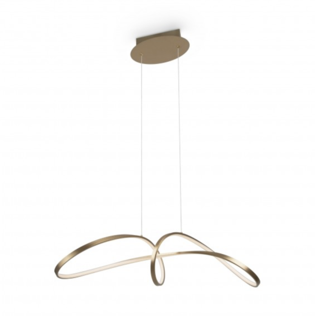 LED Griestu lampa Maytoni Curve kolekcija, vācu ražotājs. Lampa izgatavota no metāla un nokrāsota zeltītā krāsā. Kopējais lampas augstums 150cm, platums 26cm un garums 92cm. Iestrādātas LED diodes ar kopējo jaudu 42W. Izstaro neitrāli baltu gaismu 4000K, gaismas plūsma 2800lm. Paredzēta uzstādīšanai iekštelpās, aizsardzības pakāpe IP20.