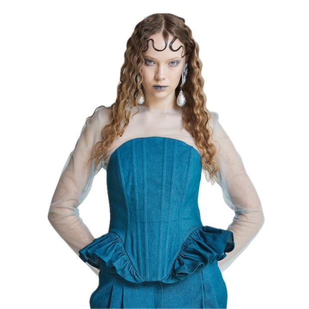 Abyssal Current korsete ir izgatavota no 100% teksturētas džinsa kokvilnas dziļā jūraszāļu zilā tonī. Siluets ir izteikti modelēts vidukļa zonā, ar arhitektoniskām šuvēm, kas vizuāli pagarina torsu. Gurnu daļā kročoti volānu paneļi veido skulpturālu vilni – nevis dekoratīvu, bet virzienu definējošu. Forma ietver ķermeni kā kustībā sastingušu ūdeni. Aizmugures šņorējamā aizdare ļauj precīzi pielāgot piegulumu, radot spriegojumu un struktūru pretstatā auduma maigumam.