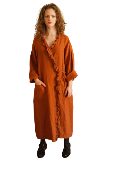 Šis halāts ir izgatavots no 100% tīra franču lina, ideāli piemērotu ģērbšanai dažādos klimatiskajos apstākļos, valkāšanai sasietā veidā vai tāpat nesasienot. Visi apģērbi ir rūpīgi izgatavoti no ilgtspējīga, 100% franču lina auduma, kas ir mīksts ādai un vēss valkāšanai siltās vasaras dienās. Katra kleita tiek individuāli šūta ar mīlestību un rokām tūlīt pēc pasūtījuma veikšanas. Jūs iemīlēsieties mūsu lina tīrajā maigumā.
