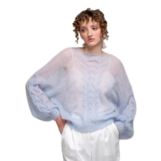 Šis ar rokām adītais kidmohēras džemperis maigā pasteļzilā tonī ir tīra viegluma un komforta iemiesojums. Izgatavots no 100% augstākās kvalitātes kidmohēras, tas ir neticami mīksts, pūkains un viegli caurspīdīgs ar gaisīgu, mežģīnēm līdzīgu adījuma struktūru. Tam ir brīva, apaļa kakla līnija, oversize piegriezums, garas piedurknes un skaista, izteiksmīga pīnītes raksta josla priekšpusē, kas piešķir īpašu akcentu.