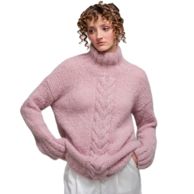 Šis adītais kidmohēras džemperis putekļaini rozā tonī ir tīrs komforta iemiesojums. Izgatavots no 100% augstākās kvalitātes kidmohēras, tas ir neticami mīksts, pūkains un viegls valkāšanai. Tam ir klasiska augstā apkakle, brīvs oversize siluets, garas piedurknes un izteiksmīga pīnītes raksta josla priekšpusē, kas piešķir īpašu akcentu. Ideāli piemērots slāņošanai vai valkāšanai kā galvenajam apģērba gabalam – silts, mājīgs un piepildīts ar maigu greznību.