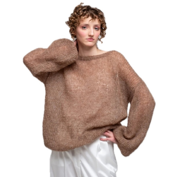 Šis ar rokām adītais kidmohēras džemperis siltā karameļu tonī ir tīra viegluma un komforta iemiesojums. Izgatavots no 100% augstākās kvalitātes kidmohēras, tas ir neticami mīksts, pūkains, viegls kā spalva un viegli caurspīdīgs ar gaisīgu, elpojošu adījumu. Tam ir brīva, apaļa kakla līnija, ērts oversize piegriezums, garas piedurknes un vienkāršs, gluds adījums, kas ļauj izcelties materiāla dabiskajam pūkumam un plūdumam.
