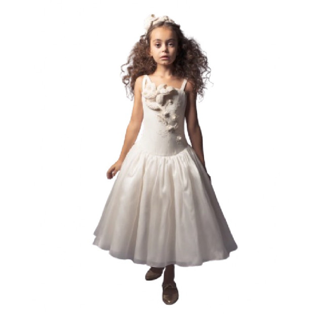 Midi garuma princeses stila kleita ar divdaļīgu, regulējamu korsetes tipa augšdaļu. Kleita ir skaisti rotāta ar ar rokām tamborētiem 3D ziedu aplikācijām un smalku pērlīšu izšuvumu, kas simbolizē ziedu rakstus un jūgendstilam raksturīgās lilijas, izceļot kleitas valdzinošo skaistumu.