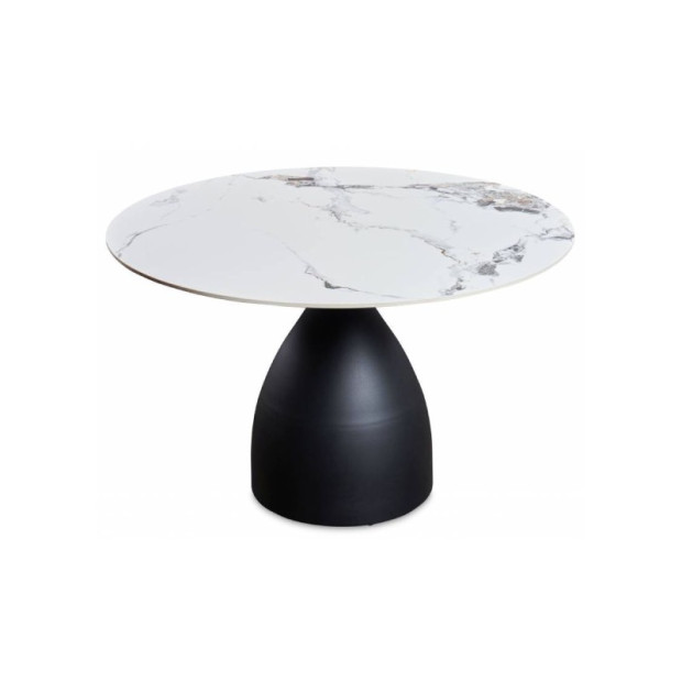 Ekskluzīvs, moderna dizaina galds VENTO. Galda virsma no marmora imitācijas akmens masas, centrēta apaļas formas kāja no metāla. Galda diametrs ir 120 cm, kas nozīmē, ka ap to var sasēdināt pat sešus cilvēkus.