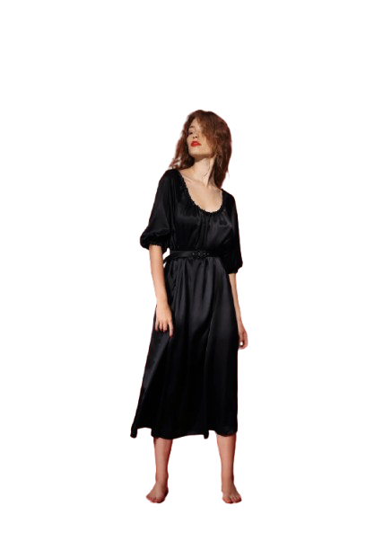 Zīda drapēta kleita ar regulējamu apkakles lenti aizmugurē. Brīvā piegriezuma, elegantā un vieglā zīda kleita ir daudzfunkcionāla. Tā radīta ērtai ikdienas valkāšanai pilsētā, bet lieliski piemērota arī atvaļinājumam. Izcel vidukli un pārvērt to par vakarkleitu, pievienojot pieskaņotu zīda jostu.