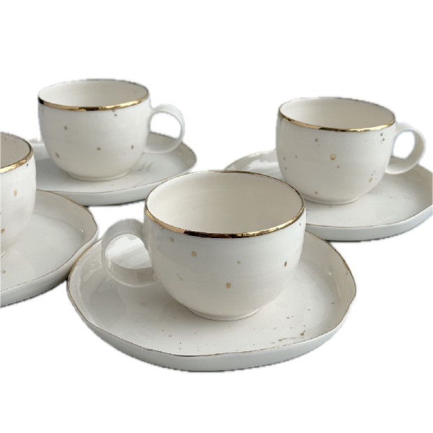 Balta porcelāna krūze ar zelta maliņu un šļakstiem komplektā ar apakštasi. Porcelāna krūze ir 350 ml ietilpīga. Apakštases diametrs: 17 cm.