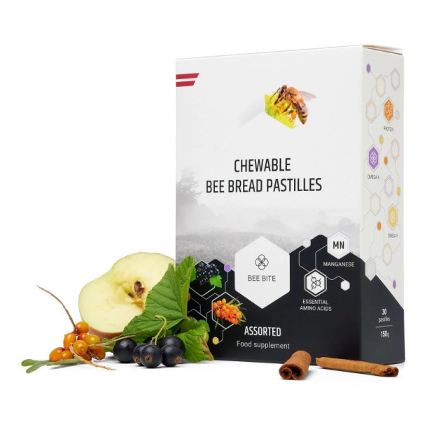 100% dabīgs, augu izcelsmes uztura bagātinātājs. Sastāvdaļas: 96% bišu maize; 4% upenes/ smiltsērkšķu ogas/ 3% āboli, 1%kanēlis. BEE BITE bišu maizes košļājamās pastilas ir dabīgs olbaltumvielu un mangāna avots. Bišu maize ir aminoskābes saturoši, fermentēti ziedputekšņi, kurus bites sagatavo kā pilnvērtīgu uzturu jauno bišu barošanai pavasara sezonā.
