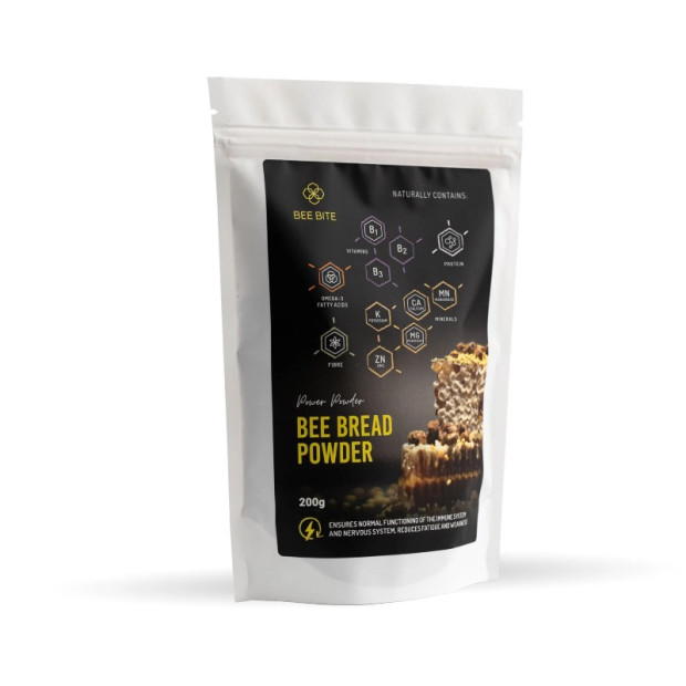 BEE BITE Power Powder (Spēka pulveris). Sastāvdaļas: 100% bišu maizes pulveris. BEE BITE bišu maizes pulveris ir olbaltumvielu, šķiedrvielu, magnija un omega-3 taukskābju avots. Tas dabīgi satur daudz vitamīnus B1, B2, B3, kāliju, kalciju, dzelzi, mangānu, varu un cinku. Lietošana: bišu maizes pulveri ērti iekļaut ikdienas uzturā, pievienojot 15-20 gramus produkta kokteiļiem un brokastu putrām.