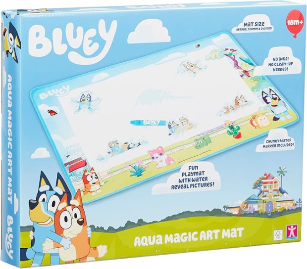 Atklāj burvīgu zīmēšanu ar Bluey Aquamagic paklāju! Vienkārši piepildi komplektā iekļauto ūdens pildspalvu un vēro, kā uz paklāja parādās Bluey un viņas ģimene. Otrā pusē ir daudzkrāsaina brīvās zīmēšanas zona, kur bērni var radīt paši savus mākslas darbus. Kad ūdens izžūst, attēli pazūd un jautrība var sākties no jauna. Viegls un salokāms ērtai uzglabāšanai un pārnēsāšanai.