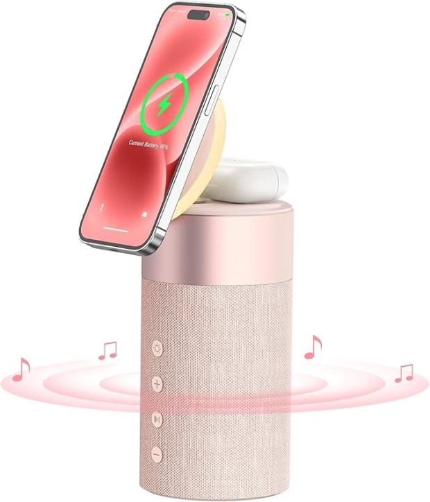 COLSUR 2-in-1 bezvadu uzlādes stacija ar Bluetooth skaļruni un naktslampiņu piedāvā ātru uzlādi iPhone 16/15/14/13/12 sērijai un AirPods Pro/3/2. Jaunākās paaudzes Bluetooth 5.1 savienojums, magnētiska telefona statīva stabilitāte, energoefektīvs LED apgaismojums un kompakts dizains padara to par ideālu aksesuāru mājām vai dāvanai.