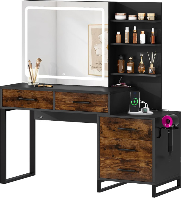 Pievienojiet savam skaistumkopšanas rituālam ērtību un izsmalcinātību ar YITAHOME stilīgo un daudzfunkcionālo kosmētikas galdu (40D x 88W x 143.6H cm), kas apvieno plašu uzglabāšanas vietu, modernu dizainu un praktiskumu. Galds piedāvā 5 ietilpīgas atvilktnes, 3 plauktus, fēna turētāju, 2 kontaktligzdas un 2 USB. Galdam ir iebūvēts LED apgaismojuma spogulis ar trīs regulējamiem gaismas toņiem, kas nodrošina ideālu apgaismojumu ikvienai situācijai. Izgatavots no 15 mm bieza augstas kvalitātes kokskaidu paneļa, nodrošinot stabilitāti un ilgmūžību. Tā gludā un vienmērīgā virsma piešķir elegantu un modernu izskatu, lieliski papildinot jebkuru interjeru.