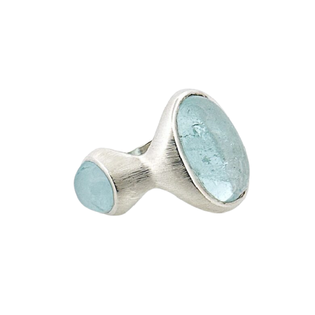 Sudraba gredzens ar diviem akvamarīniem. Skaidrība un miers kā jūras dziļumos — gaisma, kas iedod vieglumu un spēku reizē.