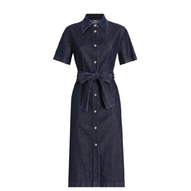 Zilā krāsā, priekšējā pogu aizdare, jostasvietā ar jostu, klasiska apkakle, īsas piedurknes.