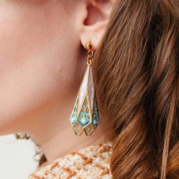 Izsmalcināti veidoti filigrānā un ar rokām apdarināti ar ūdensizturīgām zelta detaļām, katrs izstrādājums papildināts ar mirdzošiem, emaljai līdzīgiem akcentiem, kas pārklāti ar UV sveķiem, radot izsmalcinātu stikla efektu. Smalkā patina piešķir dziļumu un raksturu – eleganci, ko veidojis laiks, nevis tendences.