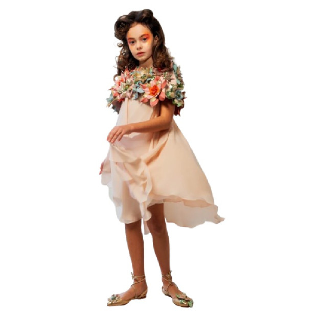 Košs, mūsdienīgs pasaku dārza komplekts, kas sastāv no vieglas, smalkas zīda kleitas ar lencītēm un ādas plecu apmetnīša, kas pilnībā pārklāts ar maģiskiem, individuāli veidotiem ādas ziediem. Apmetnītis ir izklāts ar zīdu. Kleita piegriezta pa slīpo pavedienu, radot plūstošu un gaisīgu, ēterisku siluetu.