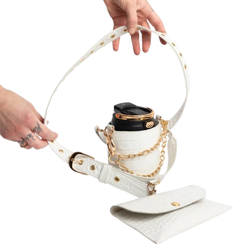 Ādas kafijas krūzes turētājs ar pievienotu maciņu. Krokodila reljefa āda. Ādas odere. Aizdare ar sprādzi. Regulējams izmērs. Zelta krāsas furnitūra. Noņemams ādas maciņš.