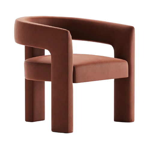 Grezns atzveltnes krēsls ar skulpturālu siluetu, apvilkts ar bagātīgu terakotas samtu. Tā drosmīgais, atvērtā atzveltnes dizains un biezais polsterētais sēdeklis nodrošina pārsteidzošu estētikas un komforta līdzsvaru, padarot to par izteiksmīgu elementu jebkurā telpā.