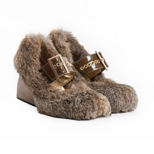 Brūni kažokādas augstpapēžu apavi. Dabīga kažokāda brūnā krāsā. Brūna lakāda. Ādas odere. Regulējama siksniņa. Zelta krāsas furnitūra. Tunith zole. Ar rokām izgatavots koka papēdis ar lakādas apdari. Papēža augstums aptuveni 90 mm.