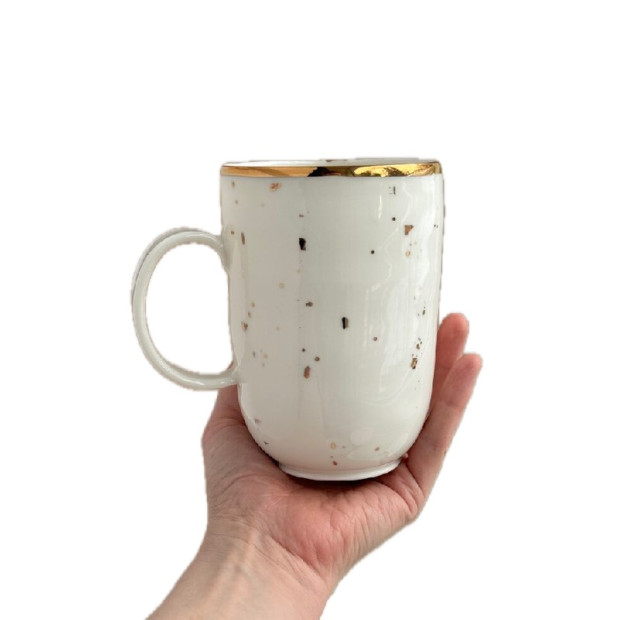Balta porcelāna krūze ar zelta šļakstiem. Porcelāna krūze ir 400 ml ietilpīga. Katrs keramikas izstrādājums ir ar rokām veidots, tāpēc tie ir unikāli un neatkārtojami. Attēlā redzamie, iespējams, nedaudz atšķirsies no Jums piegādātā.