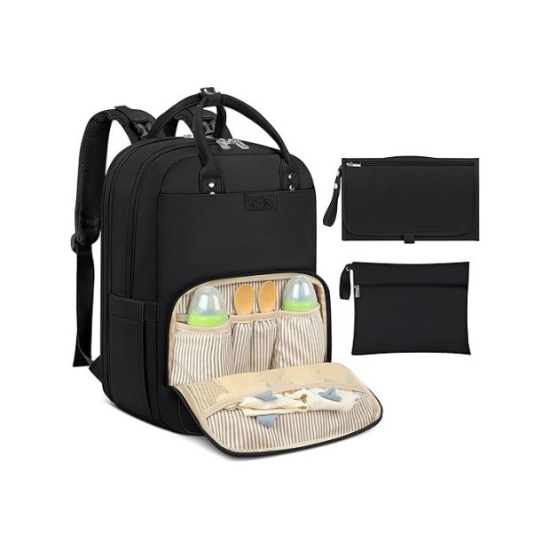 Šī daudzfunkcionālā bērnu pārtinamā soma padara ikdienas rūpes par mazuli ērtākas un organizētākas — liela izmēra mugursoma (31 x 21 x 44 cm) ietver pārnēsājamu pārtinamās virsmas paklājiņu un ūdensizturīgu maisiņu netīrajām autiņbiksītēm. Somā ir 18 dažādas kabatas, tai skaitā liela galvenā nodalījuma kabata 15,6 collu klēpjdatoram, autiņbiksīšu organizators, mammas kabata ar atslēgu piekariņu, siltinātas pudelīšu kabatas, pretzagšanas kabata mugurpusē, kā arī kabatas salvetēm un ūdens pudelei. Ērtai lietošanai komplektā iekļauts arī pārtinamās virsmas paklājiņš ar autiņu un salvešu kabatām, kā arī praktisks mitro lietu maisiņš. Tos var pārnēsāt rokā, somā vai ērti piestiprināt pie ratiem, pateicoties komplektā esošajām ratu siksnām. Somai ir ūdensizturīgs audums un viegli tīrāma odere, savukārt ergonomiskā mugurpuse un mīkstās plecu siksnas nodrošina komfortu ikdienas lietošanā. Divkāršie rāvējslēdzēji ļauj viegli piekļūt vajadzīgajām lietām pat ar vienu roku. Uzlabotajās termokabatās iespējams ievietot dažādu zīmolu pudelītes, bet elastīgās siksniņas uzturēs arī karotes un dakšiņas drošībā. Stilīgais, neitrālais dizains (pieejams melnā vai baltā krāsā) padara šo somu piemērotu gan mammām, gan tētiem. To var izmantot kā mugursomu, plecu somu, ceļojumu somu vai ikdienas somu, padarot to par lielisku dāvanu jaunajiem vecākiem!