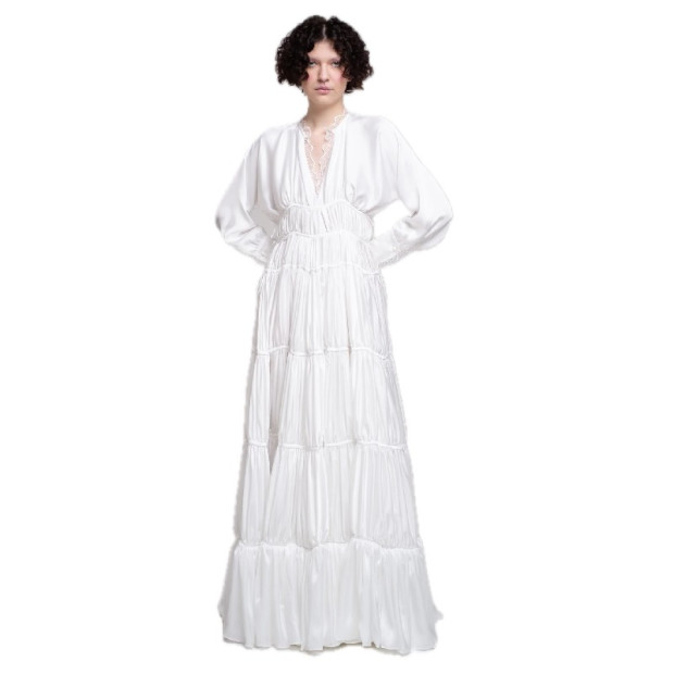 Lilium Blanc Couture kleita veidota no slāņaina zīda maisījuma satīna, kas rūpīgi kročots, lai radītu skulpturālu apjomu un plūstošu kustību. Katrs horizontālais slānis ir formēts un nostiprināts ar rokām apstrādātām šuvēm, ļaujot kleitai krist kontrolētā, maigā plūdumā. Kakla izgriezumu ietver smalkas mežģīņu detaļas, kas niansēti atkārtojas piedurkņu galos. Siluetu iespējams pielāgot ķermenim ar integrētām satīna lentēm, ļaujot izcelt vidukli un regulēt proporcijas pēc vēlmes. Diskrētas āķīšu aizdares priekšpusē piešķir daudzpusību – valkājama pilnībā aizvērta svinīgai elegancei vai daļēji atvērta maigākam, mūsdienīgākam tēlam.