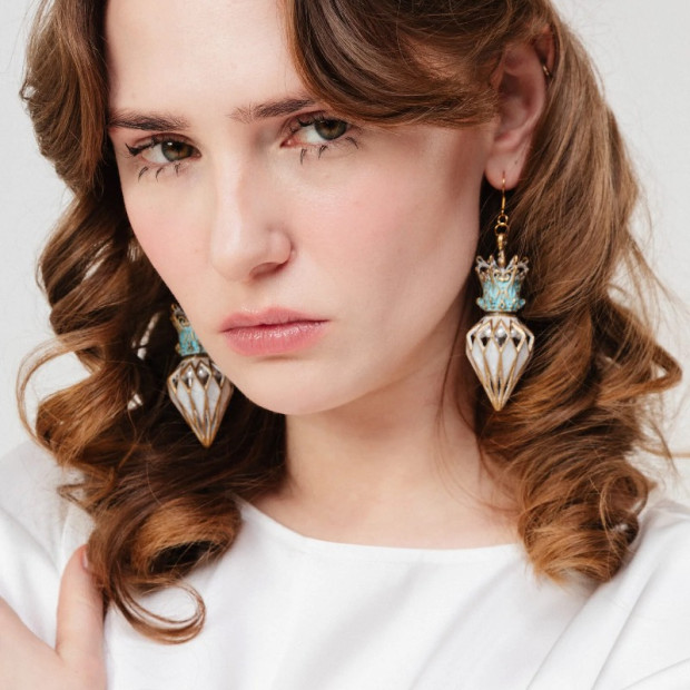 Laternas iedvesmoti izteiksmīgi auskari, kas radīti, lai atgādinātu par antīku mirdzumu un izkoptu sievišķību. Veidoti no ekoloģiskiem sveķiem ar smalku zelta filigrānu, tirkīzzilu patinu un delikātiem pērļu akcentiem, siluets iedvesmojies no jūgendstila ornamentiem un vintage ģērbtuvēm, ko izgaismo sveču gaisma. Neskatoties uz to izteiksmīgo dizainu, auskari ir viegli kā spalva un ērti valkājami ilgstoši.