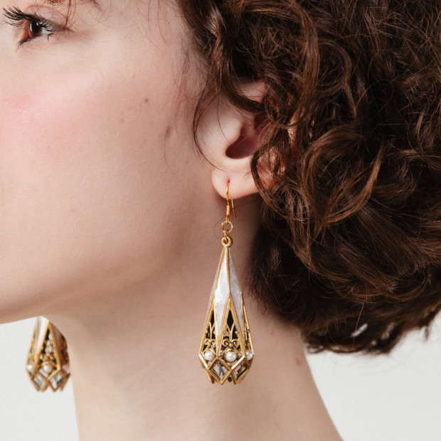 Jūgendstila siluets, ko veido gaisma, filigrāns un izkopts detaļu smalkums. Pabeigti starojošā zeltā un papildināti ar mirdzošu ziloņkaula toņa emalju, šie auskari rotāti ar smalkiem mākslīgo pērļu sakopojumiem, kas mīkstina arhitektonisko struktūru. Stiklam līdzīgie UV sveķi piešķir dziļumu un maigu mirdzumu, savukārt ažūrais filigrāns saglabā siluetu vieglu un elegantu.