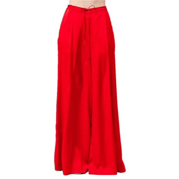 Madame Rouge Palazzo bikses iedvesmotas no rokoko galmu teatrālajiem siluetiem un vēsturisko portretu dramatiskā plūduma. Pagarinātais, platais piegriezums rada plūstošu vertikalitāti, ļaujot audumam eleganti slīdēt ar katru soli. Izgatavotas no mirdzoša rožsarkana satīna, siluets līdzsvaro maigumu ar pārliecinošu spēku. Regulējamā jostasvieta ļauj pielāgot formu, savukārt slēptais sānu rāvējslēdzējs saglabā tīru struktūru. Diskrētas kabatas piešķir mūsdienīgu praktiskumu citādi aristokrātiskajai formai.