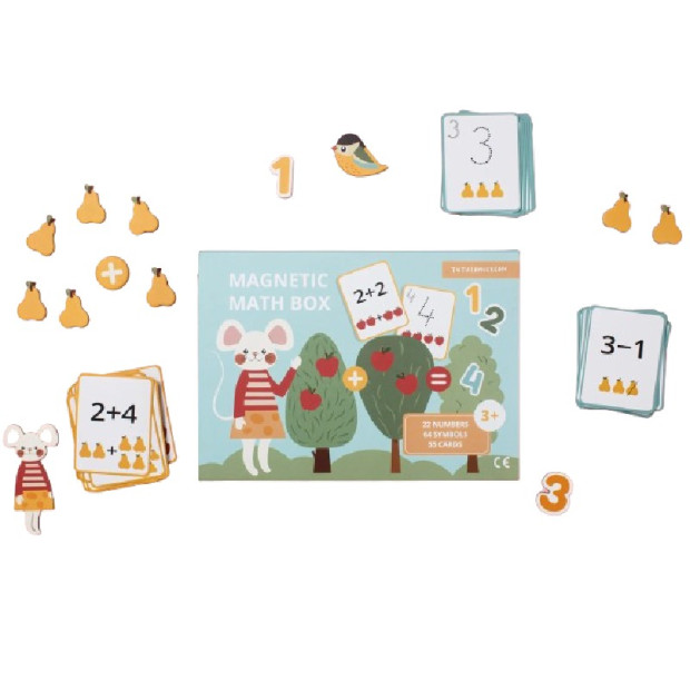 Apgūsti skaitļus un matemātiku ar Tu Tu Family Magnetic Math Box! Vecums 3+ (3-6). Kastē atradīsi: 22 ciparus, 64 simbolus (āboli, bumbieri, zīles), 55 matemātikas kartītes, 1 marķieris, + citi magnēti jautrībai.