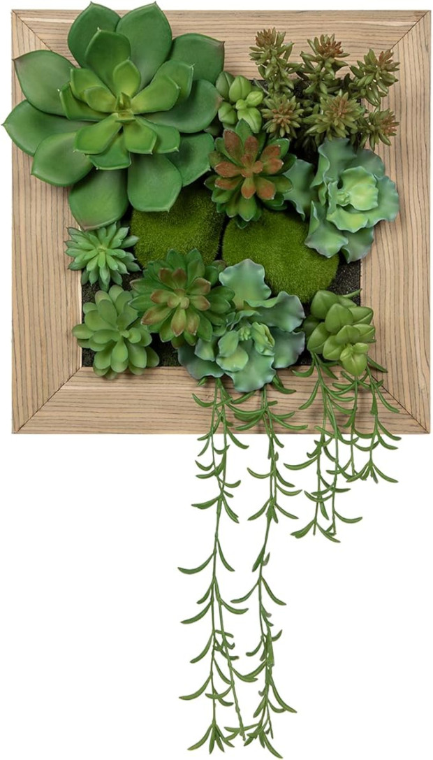 Pievienojiet dzīvotspēku un stilu jebkurai telpai ar šo modernu mākslīgo sukulentu sienas dekoru (31D x 31W x 19H cm) . 15 reālistiski noformēti 3D sukulenti, mākslīgās sūnas un pievilcīgie pērļu virtenes, viss ieliktajā koka rāmī ar rustikālu lauku šiku izskatu, piešķir telpai siltumu un komfortu. Tas ir ideāls veids, kā ienest dabas skaistumu savā interjerā, saglabājot vienkāršību un eleganci. Katrs sukulents ir izgatavots no augstas kvalitātes polietilēna plastmasas, kas nodrošina ilgmūžību un dabisku izskatu. Mākslīgie sukulenti neprasa laistīšanu, saules gaismu vai papildu kopšanu, lai saglabātu savu dzīvotspēju un spilgtumu. Vienkārši noslaukiet tos ar mitru drānu, lai noņemtu putekļus, un tie paliks skaisti un dzīvotspējīgi gadu no gada.