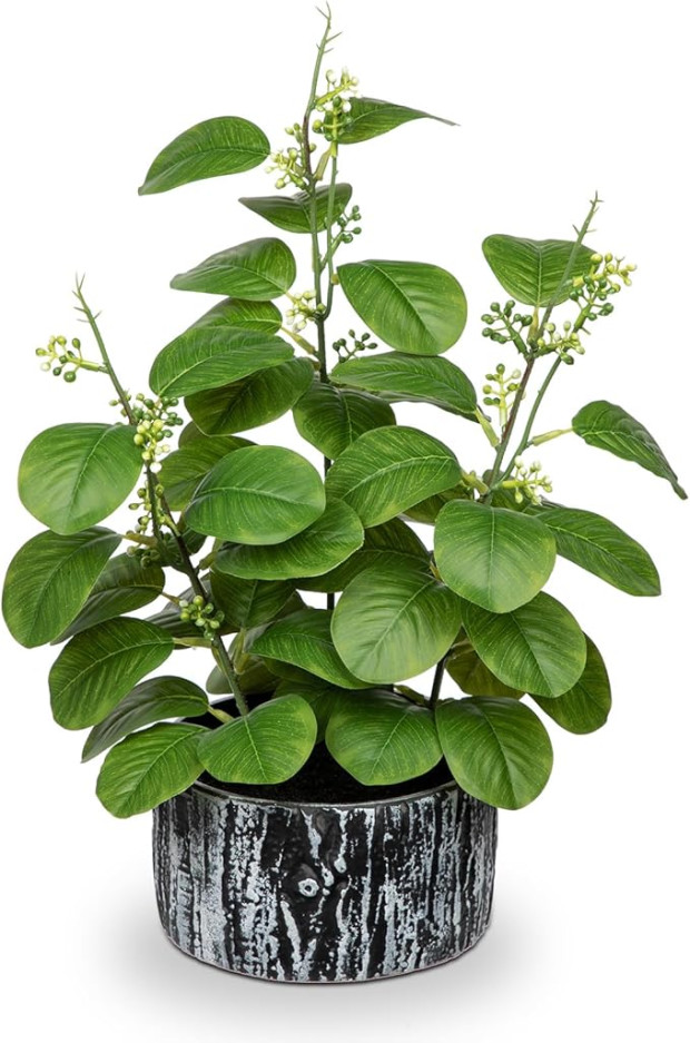 Pievienojiet dzīvīgumu un svaigumu savam interjeram ar šiem krūmiem līdzīgiem mākslīgajiem augiem rustikālo melno keramikas podiņā (33D x 12W x 12H cm). Podam ir cementa piepildījums, elegants svītrains dizains ar melniem un baltajiem akcentiem, kā arī teksturēta, nevienmērīga virsma, kas piešķir tam unikālu raksturu. Izbaudiet dzīvotspējīgo krāsu no fikusa auga lapām. Tumši zaļās lapas ir izgatavotas no augstākās kvalitātes zīda ar plastmasas stublājiem, un tām ir reālistiskas detaļas. Šie mākslīgie augi atdarinās reālu eikalipta auga izskatu, sajūtu un tekstūru, un tumši zaļā krāsa izskatās veselīga un reālistiska. Šis daudzfunkcionālais elements pievieno jebkurai mājai vai birojam vieglu eleganci.