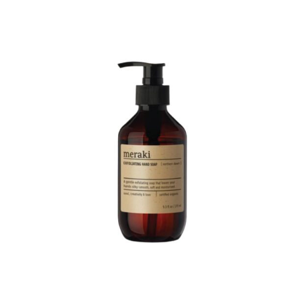 Sertificētas organiskas Meraki Northern Dawn pīlinga roku ziepes maigi attīra ādu un nodrošina saudzīgu eksfoliāciju. Aprikožu kauliņu un rīsu granulas palīdz noņemt atmirušās ādas šūnas, padarot rokas gludas, mīkstas un koptas. Organiskā alveja un glicerīns intensīvi mitrina un mīkstina ādu, savukārt organiskā kliņģerīte ar antioksidantiem palīdz nomierināt un aizsargāt ādu no apkārtējās vides ietekmes. Pēc lietošanas rokas ir tīras, maigas un pabarotas. Lietošana: Samitrini rokas, uzklāj nelielu daudzumu ziepju un maigi iemasē. Noskalo ar ūdeni. Piemērotas ikdienas lietošanai un visiem ādas tipiem. Tilpums: 275ml