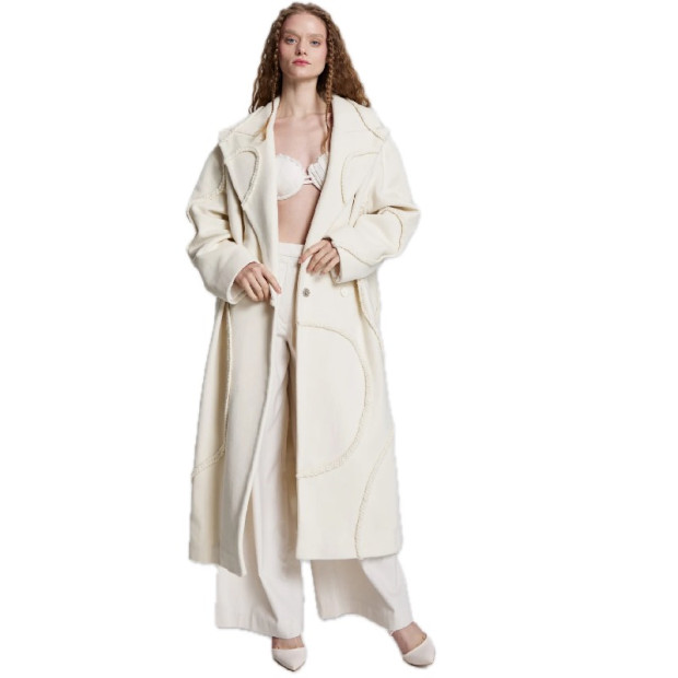 Šis garais mētelis ir izgatavots no 100% merīnvilnas un papildināts ar izteiksmīgu, tamborētu vilnas pīnītes detaļu. Strukturēts, taču plūstošs, tas nodrošina siltumu, aizsardzību pret vēju un tekstūru, vienlaikus saglabājot arhitektonisku eleganci laikmetīgā siluetā. Pilnībā oderēts komfortam un ērtai slāņošanai, tas radīts, lai bez piepūles pielāgotos dažādām sezonām un situācijām – no izsmalcināta ikdienas tēla līdz vakara elegancei.
