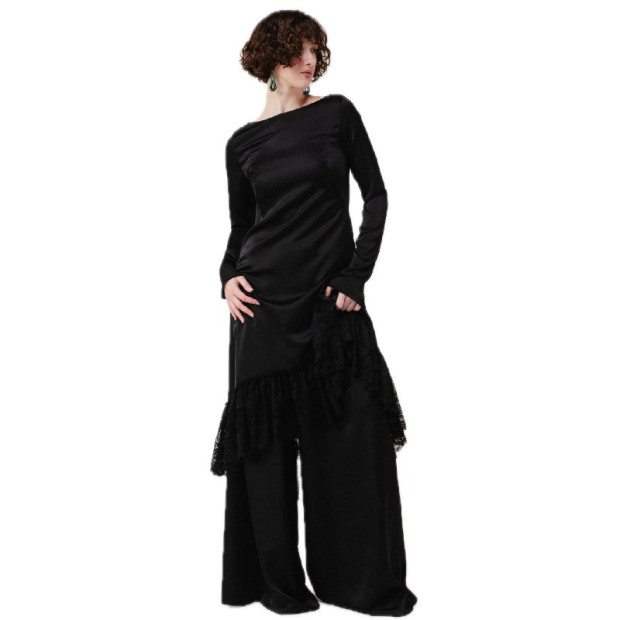 Noir Héritage Midi kleita veidota tā, lai ar klusu precizitāti piegulētu ķermenim, pirms plūstoši pāriet maigā, ar mežģīnēm apdarinātā apakšmalā. Siluets vizuāli pagarina augumu, vienlaikus saglabājot kustības brīvību caur satīna struktūru. Piegulošās piedurknes līdzsvaro kompozīciju, radot kontrastu ar smalkajām franču mežģīnēm, kas ietver kleitas apakšdaļu. Mežģīnes piešķir dziļumu un ēnu, nevis dekorativitāti – izsmalcinātību bez pārmērības. Izgatavota no inovatīva, burzīšanās izturīga satīna, audums saglabā savu nevainojamo virsmu visas dienas garumā un ir noturīgs pret ūdens pēdām, ļaujot viegli pāriet no dienas uz vakara notikumiem.
