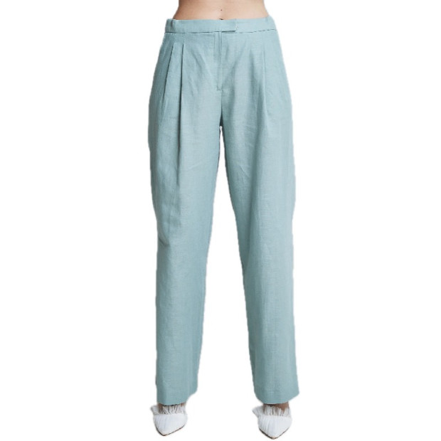 Šīs bikses ir izgatavotas no 100% lina pieklusinātā salvijzilā tonī. Veidotas ar priekšējām ielocēm un taisna piegriezuma siluetu, tās nodrošina tīru struktūru, vienlaikus saglabājot dabisku kustību. Slēpta, regulējama jostasvieta nodrošina elastību, nemainot minimālistisko ārējo līniju. Rezultātā iegūtas izsmalcinātas, elpojošas bikses, kas līdzsvaro maigumu ar kontroli.