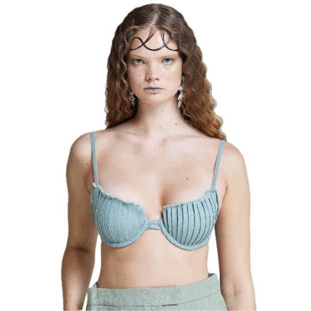 Jūras noskalots. Ar sāli mīkstināts. Sage Shell Bra tops ir izgatavots no 100% lina un ar rokām plisēts, atdarinot jūras gliemežvāku dabiskās rievas. Pieklusinātais salvijzaļais tonis piešķir dziļāku okeāna noskaņu – mazāk saules izbalināta piekraste, vairāk jūras veidots minerāls. Viegls, bet strukturēts, tops veidots ar skulpturālām kausiņiem, smalkām regulējamām lencītēm un minimālu aizmugures aizdari. Neapstrādātās plisētās malas izceļ tā organisko raksturu.