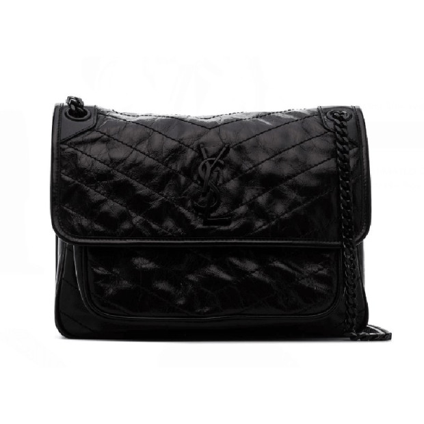 Melna, Y formas stepējums, izgatavota no krokotas ādas, regulējama slīdoša ķēdītes un ādas pleca siksna, pārlokāma atloka aizdare ar magnētu, YSL logotipa plāksnīte priekšpusē, aizmugurējā ieslidināmā kabata, divi galvenie nodalījumi, grosgrain odere ar rāvējslēdzēja un ieslidināmajām kabatām, tonāli metāla furnitūra. Izgatavota Itālijā.