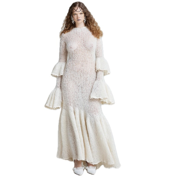 Seafoam Flamenca kleita ir ar rokām adīta no greznas kidmohēras un angoras, radīta ziemas līgavām, kuras nevēlas izvēlēties starp siltumu un eleganci. Piegulošā korsetes daļa seko ķermeņa dabiskajām līnijām, pirms atveras paplašinātā apakšdaļā, iedvesmojoties no flamenko dejotāju kustības – dramatiska, stabila un spēcīga. Piedurknes atkārto šo ritmu ar daudzslāņainu apjomu, noslēgtas ar ar rokām tamborētu, viļņotu mežģīņu apdari no zīda un kokvilnas.