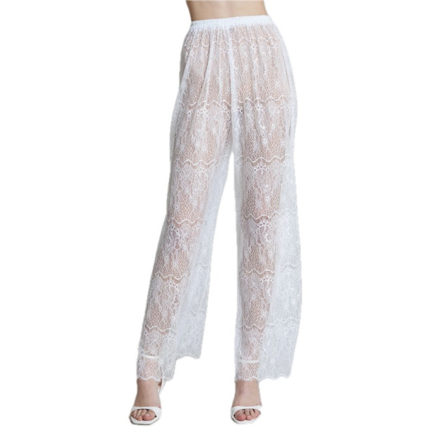 Šīs plata piegriezuma mežģīņu bikses ir izgatavotas no smalkām, franču stilā iedvesmotām mežģīnēm, kas plūstoši kustas līdzi ķermenim. Caurspīdīgā tekstūra piešķir dziļumu un maigumu, savukārt brīvais siluets nodrošina vieglumu. Tīra, elastīga jostasvieta nodrošina komfortu un elastību, ļaujot šim apģērbam līdzsvarot romantiku ar mūsdienīgu vienkāršību.