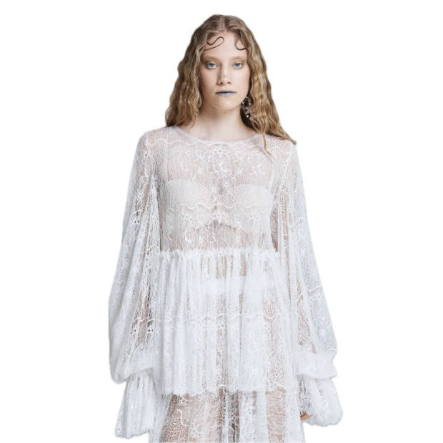Šis caurspīdīgais mežģīņu tops veidots ar skulpturālu korsetes daļu, ko līdzsvaro maiga, volānveida peplum apakšmala un kuplas piedurknes. Iedvesmots no jūras putu tekstūrām un viegla piekrastes gaisa, siluets rada kustību, vienlaikus saglabājot arhitektonisku skaidrību. Sarežģītais mežģīņu raksts nodrošina caurspīdīgumu bez trausluma, padarot to piemērotu gan svinīgiem mirkļiem, gan izsmalcinātam ikdienas tēlam.