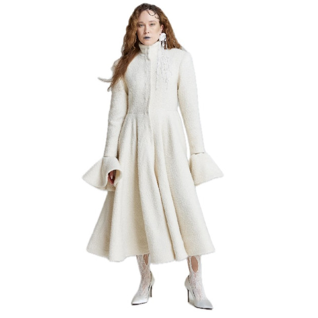 Siren Sovereign mētelis interpretē nāriņas siluetu caur strukturētu piegriezumu. Izgatavots no 100% vilnas, tas veido figūru ķermeņa augšdaļā un pāriet dramatiskā, paplašinātā apakšdaļā – atgādinot kustību, kā aste šķeļ ūdeni. Elastīgā jostasvieta smalki izceļ un definē siluetu, vienlaikus saglabājot komfortu un elastību. Noņemamās aproču detaļas piešķir piedurknēm arhitektonisku apjomu, ļaujot mainīt tēlu no tīras, strukturētas līnijas uz izteiksmīgāku, teatrālāku akcentu.