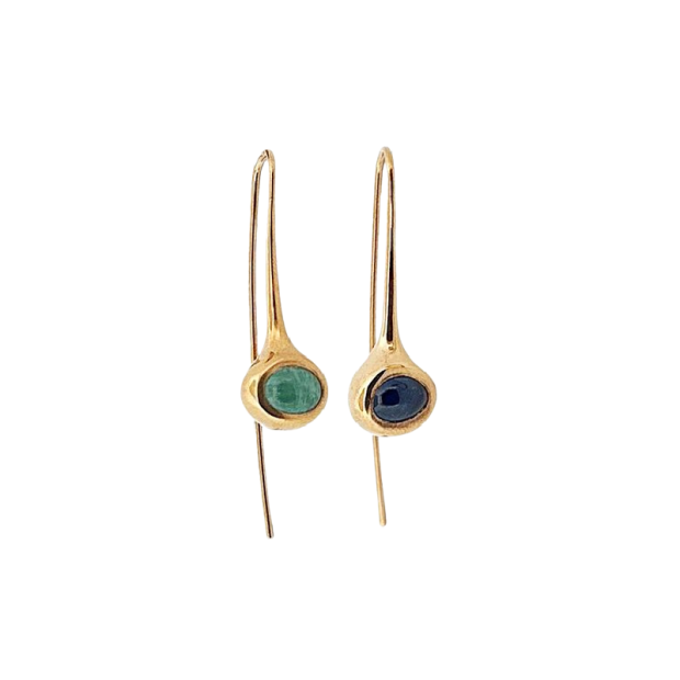 Apzeltīti sudraba auskari ar safīru un smaragdu priekšpusē un diviem mirdzošiem dimantiem aizmugurē.
