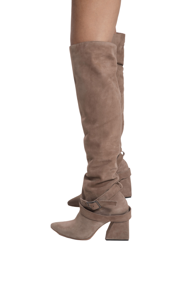 Šie zābaki no jauna definē jutekliskumu, pieguļot kājām ar gludu zamšādu un izceļoties ar drosmīgu, izteiksmīgu siluetu. Papēži piešķir pārliecību, savukārt paplašinātā stulma detaļa rada neatvairāmu šarmu. Ideāli piemēroti vakara iziešanai vai īpašiem notikumiem — šie zābaki piesaistīs skatienus ar katru soli, atstājot neaizmirstamu iespaidu.
