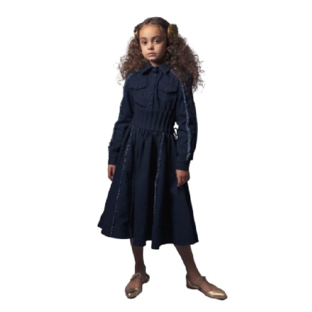 Midi garuma džinsa kreklkleita ar rievotu korsetes tipa dizainu, ko raksturo divas regulējamas korsetes detaļas aizmugurē pielāgotai piegulēšanai. Kleitas priekšpusē ir pogājama zemkrūšu daļa un divas nelielas kabatiņas papildu stilam un funkcionalitātei.