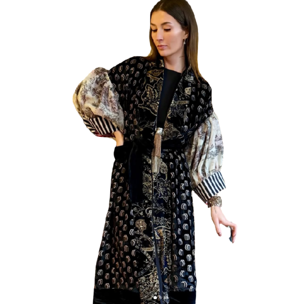 Valkājams mākslas darbs, kas apvieno filozofiju, skaistumu un komfortu vienā izsmalcinātā siluetā. Kimono veidots no 100% dabīga zīda un neparastām audumu kombinācijām, radot drosmīgu, bet harmonisku dizainu ar izteiksmīgām detaļām un plūstošu eleganci.