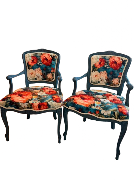 Luija XVI stila krēsli. Atjaunoti kā koša interjera odziņa. Zili zaļgans rāmis un izteiksmīgs ziedu audums. Tonis rāmim- Aubusson Blue. (2gab 440 eur).